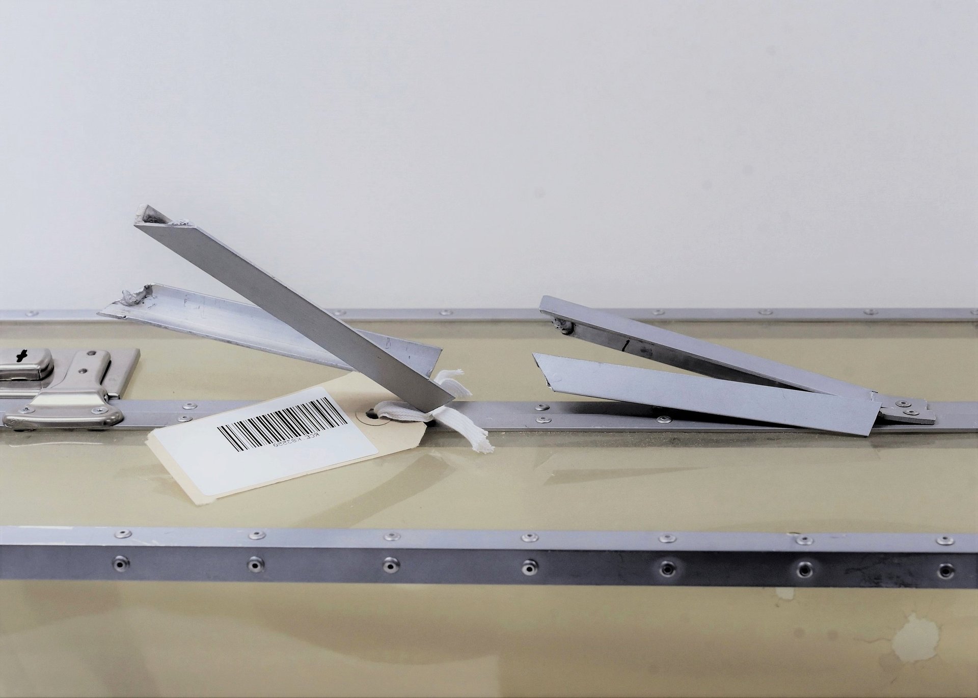 Although one might think otherwise, the handle was not deliberately destroyed by the artist. This was caused by mishandling. The aim is to treat the handle in order to restore the visual unity of the artwork and tobe able to exhibit it again with the other 11 suitcases.