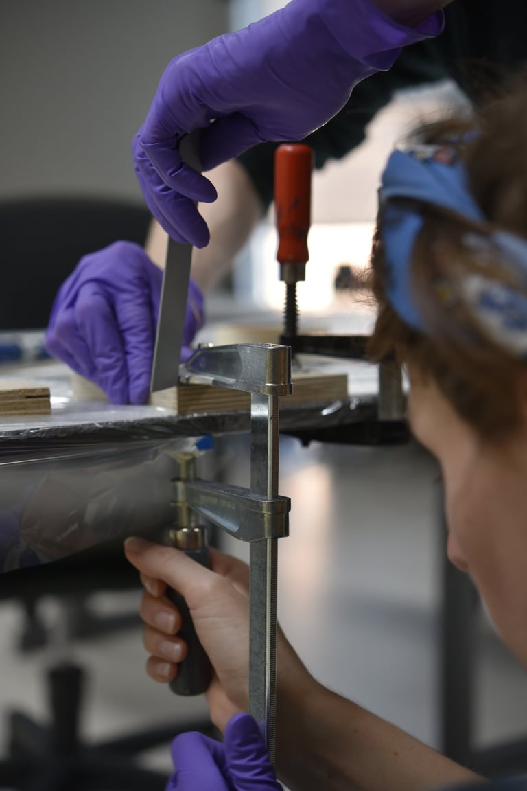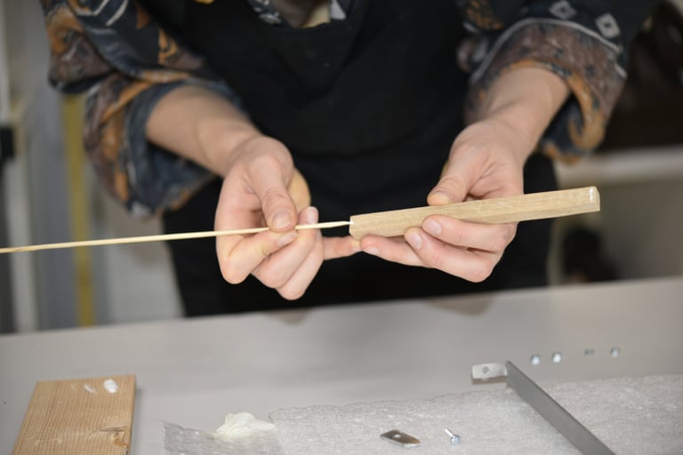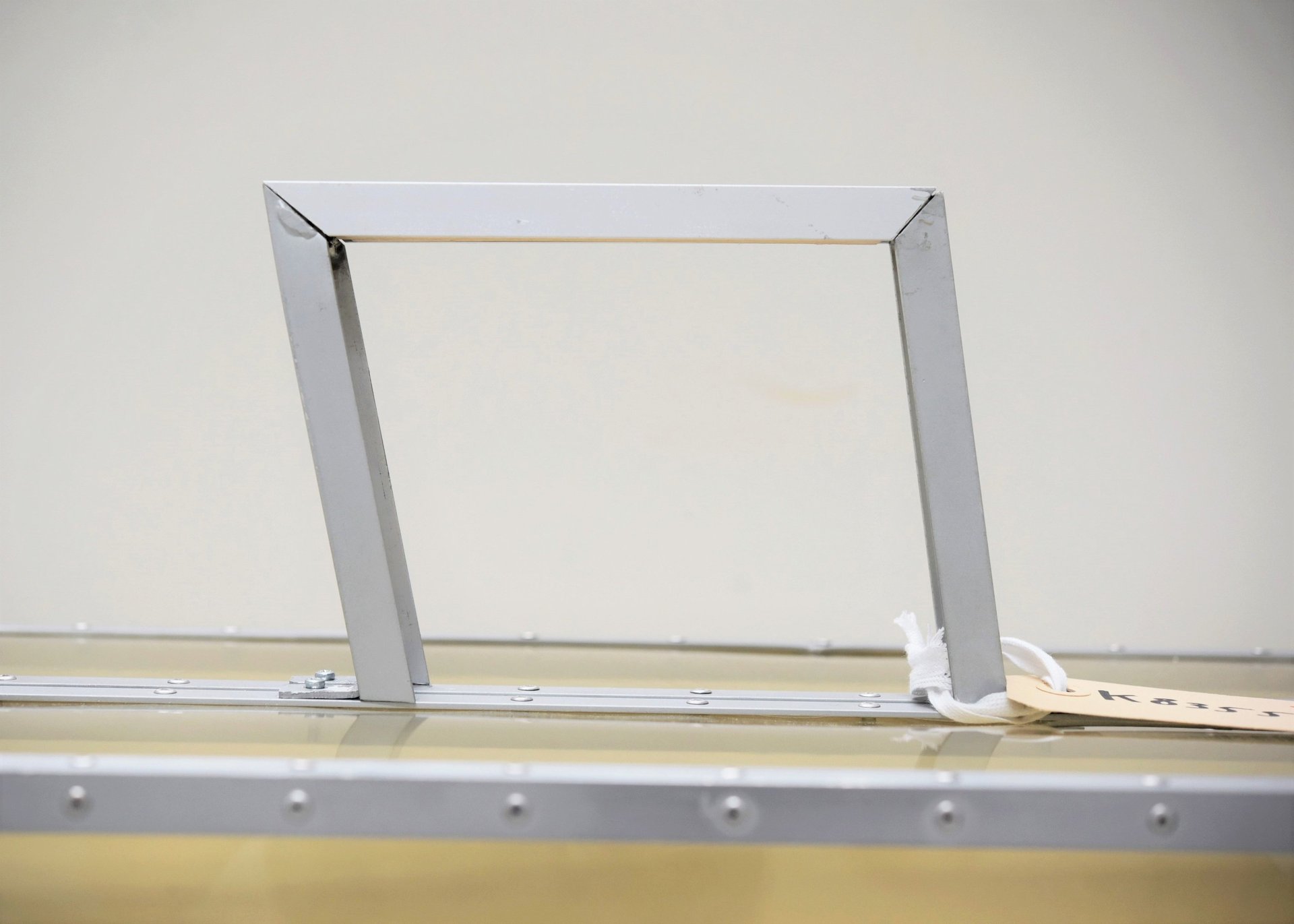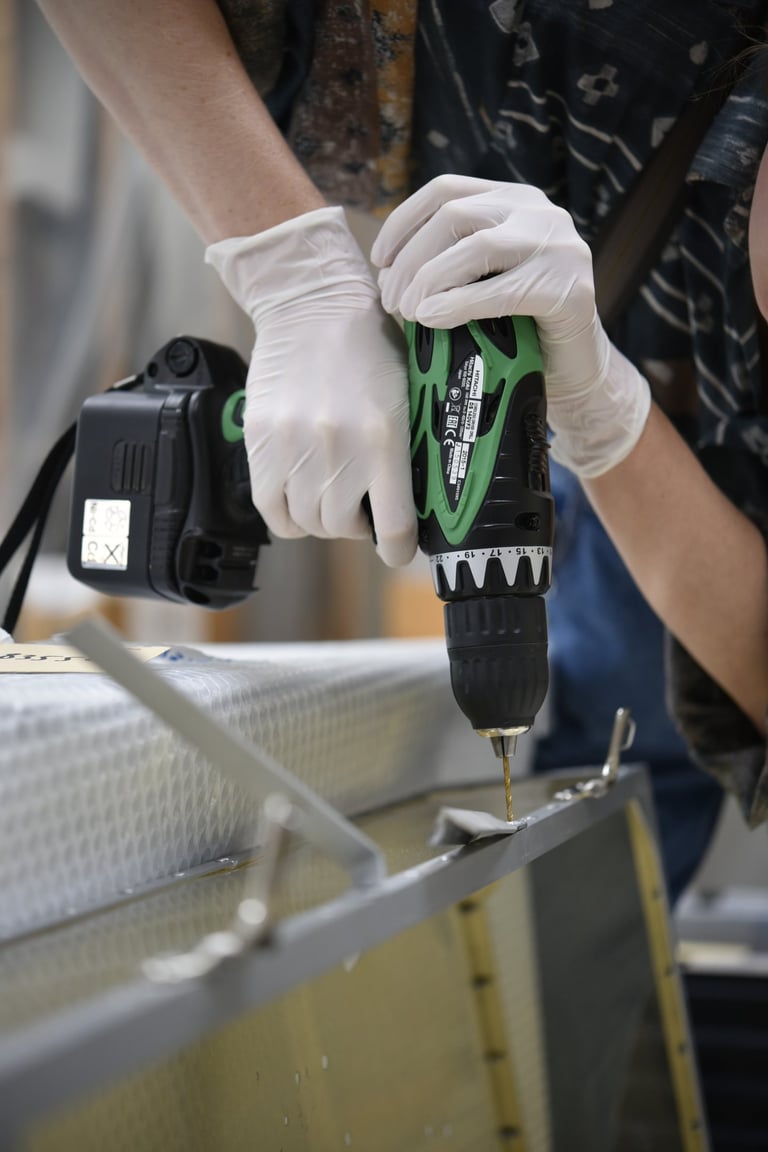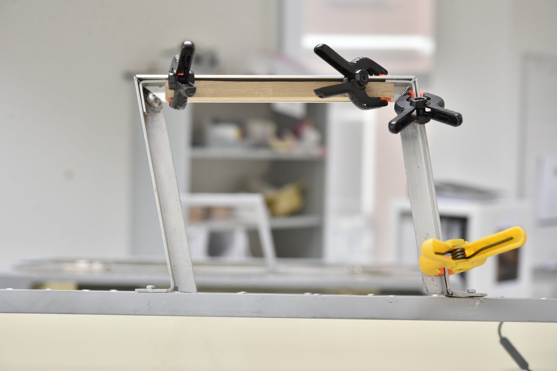 Once the entire artwork had been dusted and the paint consolidated in places, the handle could be removed from the suitcase. This step was as delicate as it was necessary to straighten the remaining parts of the destroyed handle. Once detached, the base of the parts could be flattened and the whole piece straightened out with a little pressure. Finally, two new pieces were created to replace the missing central part. This restoration was possible thanks to a thorough understanding of the manufacturing method of the case and the materials used to make it. The pieces created to replace the central part were made of aluminium and then a layer of zinc-based paint was sprayed on their surface, as was done on the original pieces. A piece of Red Meranti wood was used to reinforce the inside of the handle. This same wood could be seen on the other 11 cases in the same series.