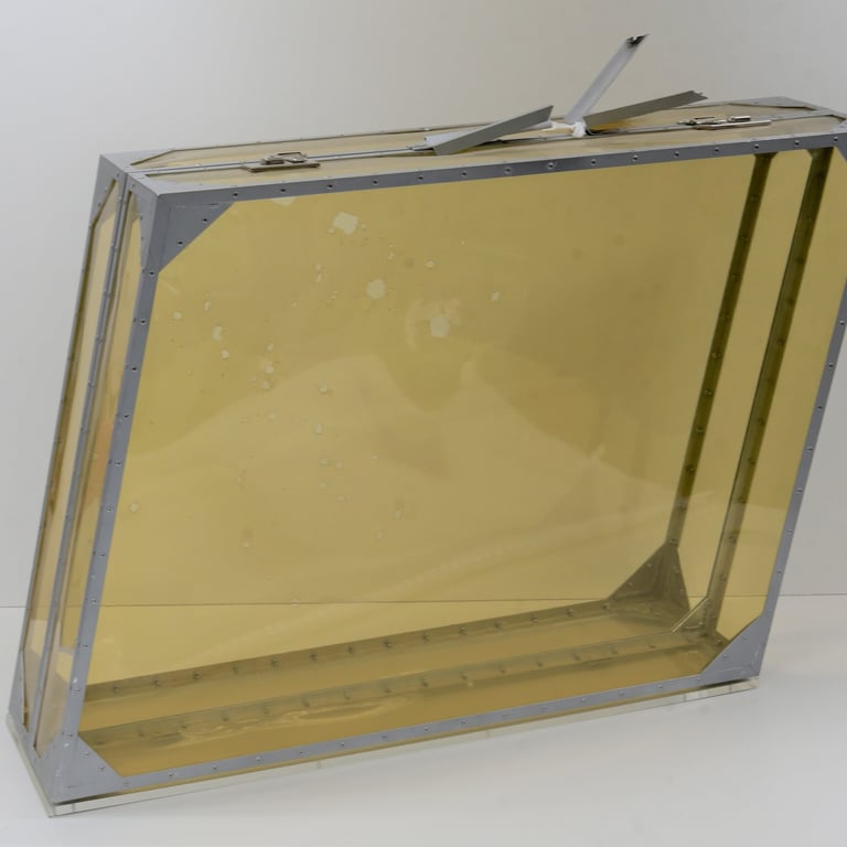 This suitcase, entitled Tours 1983, belongs to a group of suitcases known as Grenzeloze Inhoud (Unlimited Content) - an art project launched in 1983 by the Ministerie van Welzijn, Volksgezondheid en Cultuur. This project was planned as a travelling exhibition of 12 suitcases, designed by the Rotterdam designer John de Besten. The artists were limited by the predefined size of the suitcase (85 x 65 x 27 cm), its materials (a metal frame and a transparent plastic sheet), and a general theme: travel. For his suitcase, Michael Gibbs focused on concrete and visual poetry. The suitcase is completely empty, he shot it five times, leaving bullet marks in the yellowed plastic.