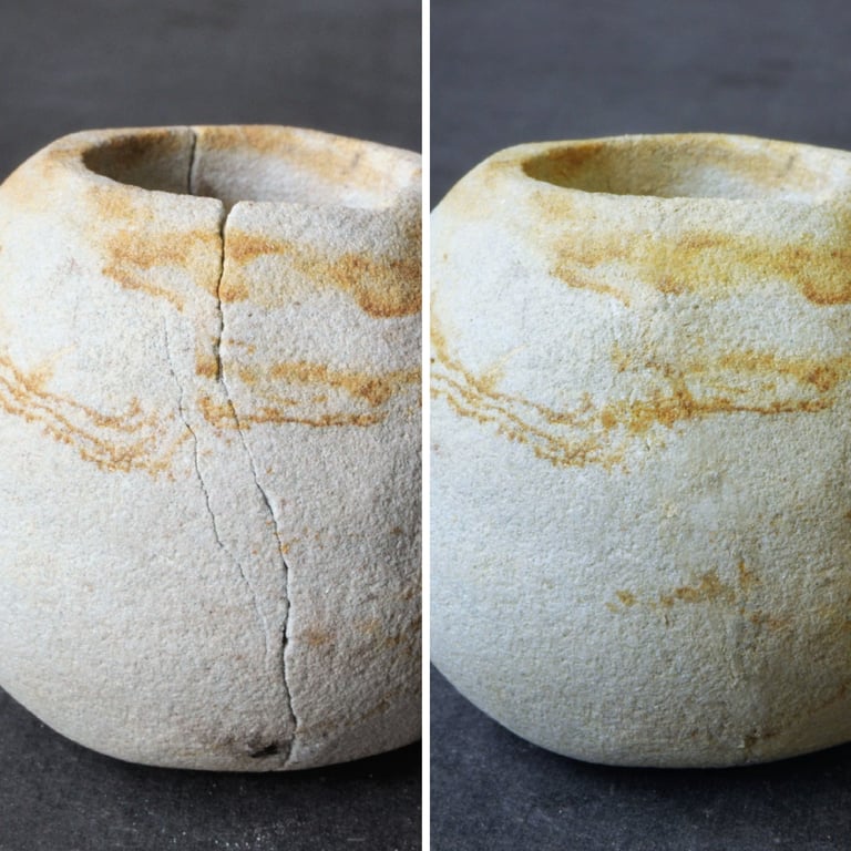 Adhesion and filling in of missing parts, retouching to restore visual unity to the stones.
