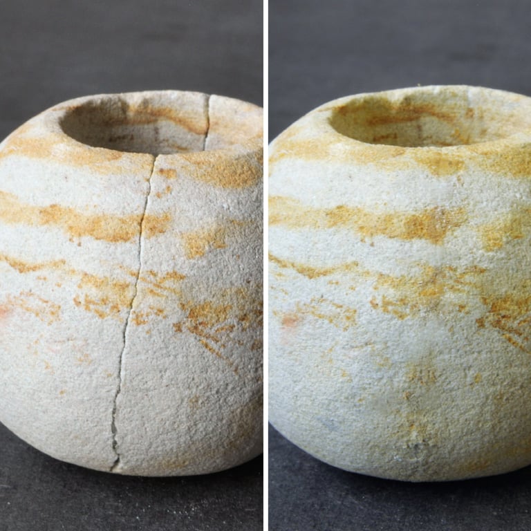 The first step is to apply an acrylic resin (Paraloid B-72) on the edges of the breaks. This step is essential to improve the reversibility of the restoration while preventing pre-penetration of the structural adhesive. For adhesion, an epoxy resin (Araldite AY 103-1) was used.