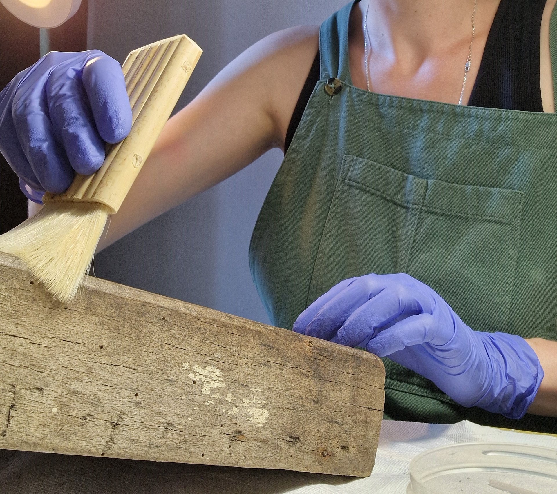 Detached wood fragments were re-adhered with a reversible and compatible adhesive, as were the torn paper sections. The rusted nail, partially dislodged, was stabilized to avoid further mechanical or chemical damage. As for the whitish stain, it was tested and then treated preventively to avoid any future fungal development.