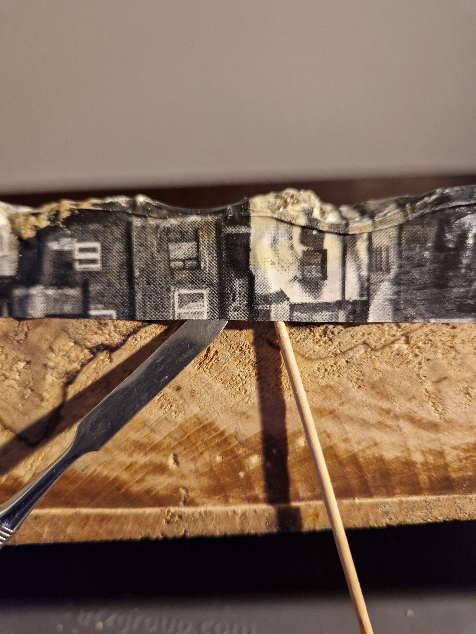 The restoration took place in several stages, beginning with a thorough observation. Using magnification and UV light, I mapped out risk areas: embedded dust, cracks in the varnish, micro-detachments of paper, unstable nails.