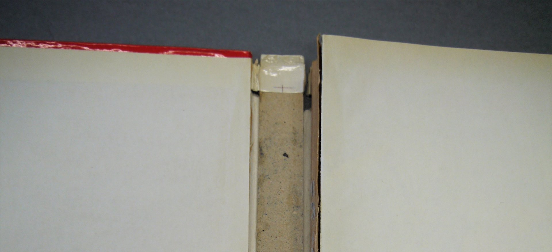 After detaching the text block from the cardboard support, the spine was entirely reinforced using japanese paper, wheat starch paste and Beva® 371 glue. The reinforcement was carried out step by step, layer by layer, with particular care given to the head and tail of the book.