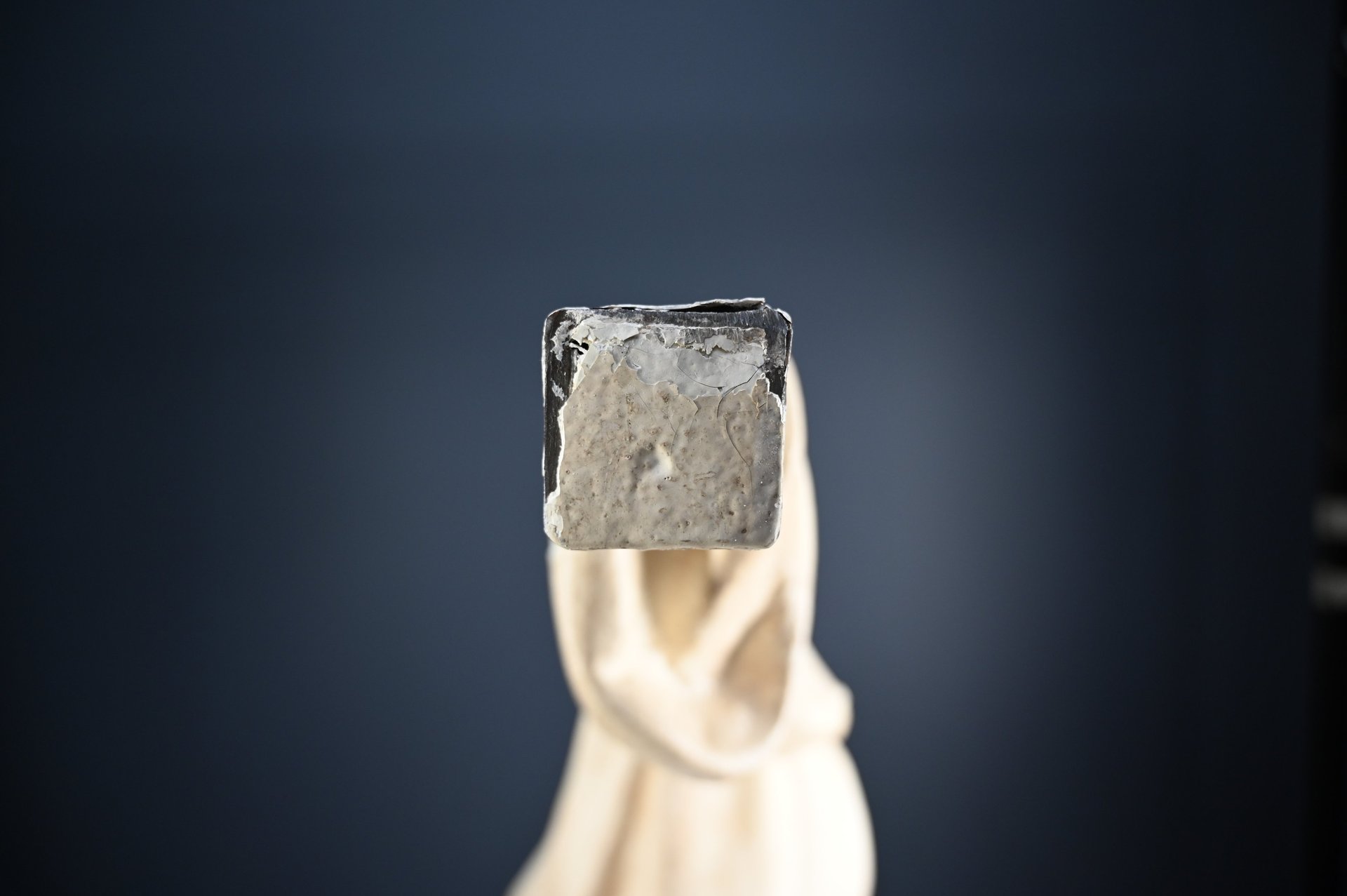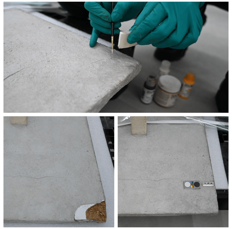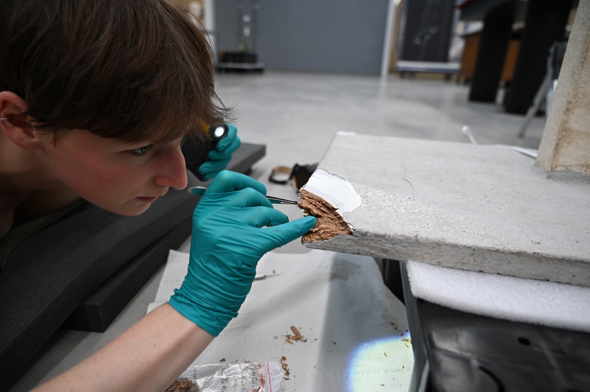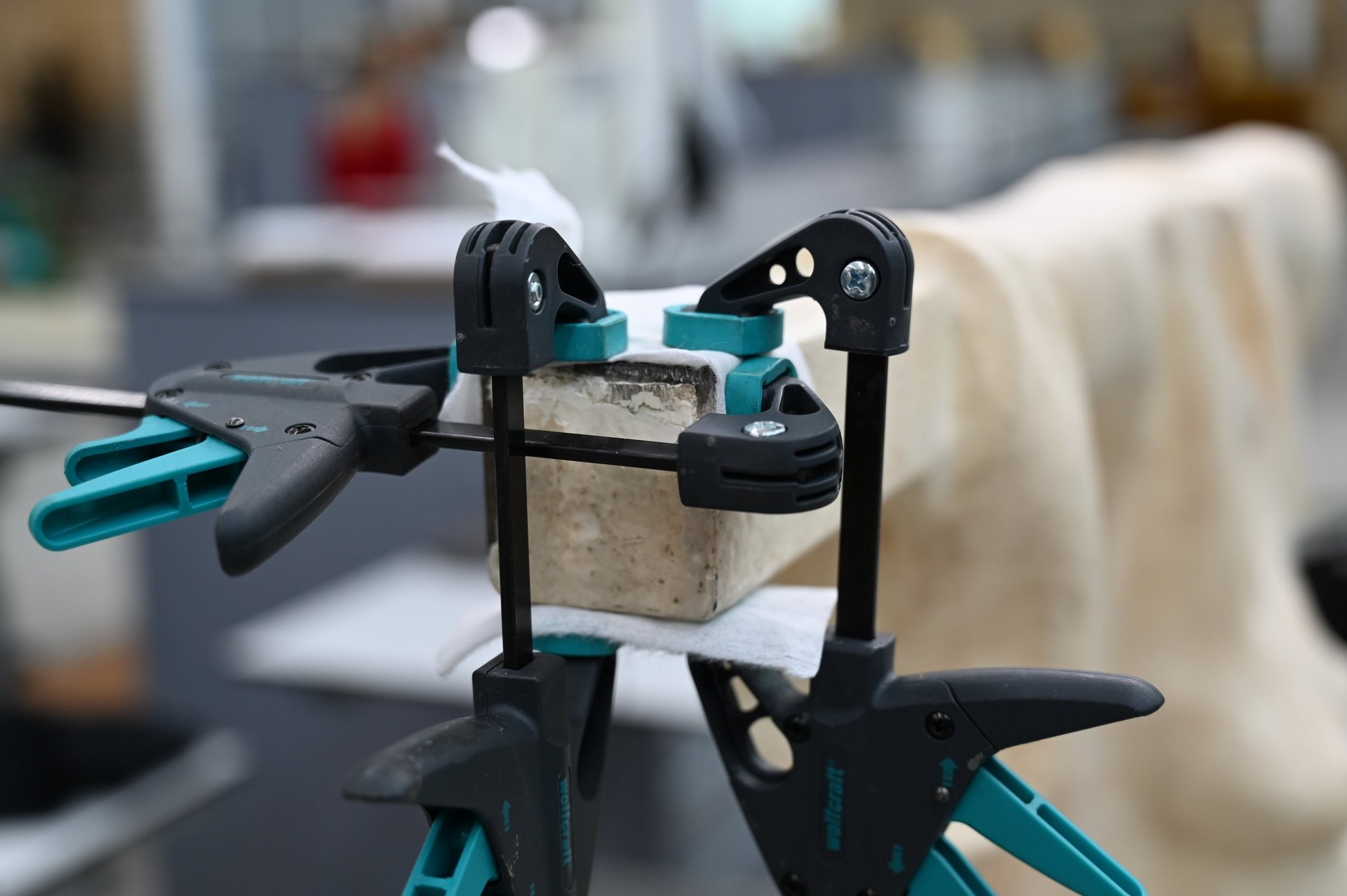 Après un nettoyage de surface, les écailles ont été refixées à l'aide de Plextol B500 appliqué à la spatule chauffante. Les fissures et les parties manquantes sur le corps principal ont été comblées à l'aide de BEVA appliqué à nouveau à la spatule chauffante. Pour éviter tout dommages, des bouts de melinex épais ont été placés systématiquement entre la spatule et la surface de l'œuvre. Ces zones ont ensuite été retouchées pour correspondre à l'esthétique générale de l'œuvre. Concernant le socle, deux angles étaient cassés, présentant des fissures et des déformations. Après avoir réussi à remettre en forme l'angle (le bois avait gonflé), un remplissage a été créé, se calquant au mieux sur la texture du béton autour. De la peinture acrylique a été utilisée pour retoucher les deux angles afin de rendre la restauration invisible à l'œil nu.