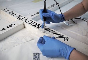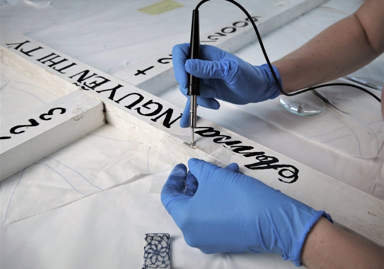 J'ai eu l'occasion de travailler sur une grande variété de matériaux, allant des plastiques (plexiglas, polyéthylène, polyester) aux métaux (archéologiques et modernes) en passant par les matériaux organiques (bois). Chaque œuvre est unique et nécessite une connaissance diversifiée de la chimie des matériaux afin de leur apporter les soins appropriés dans le respect des règles déontologiques de la conservation.
