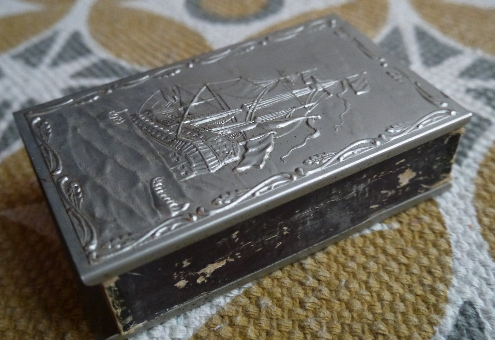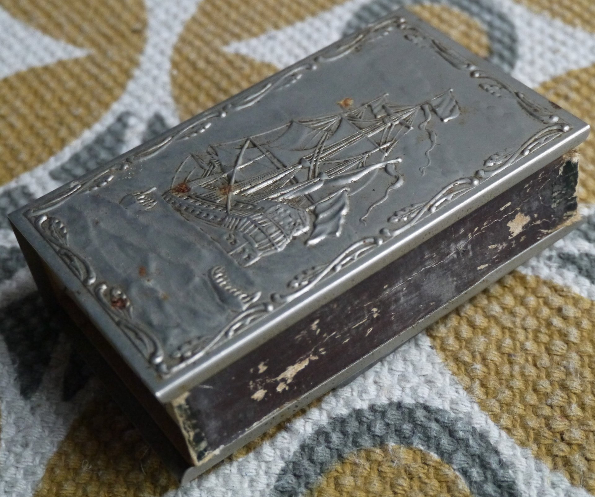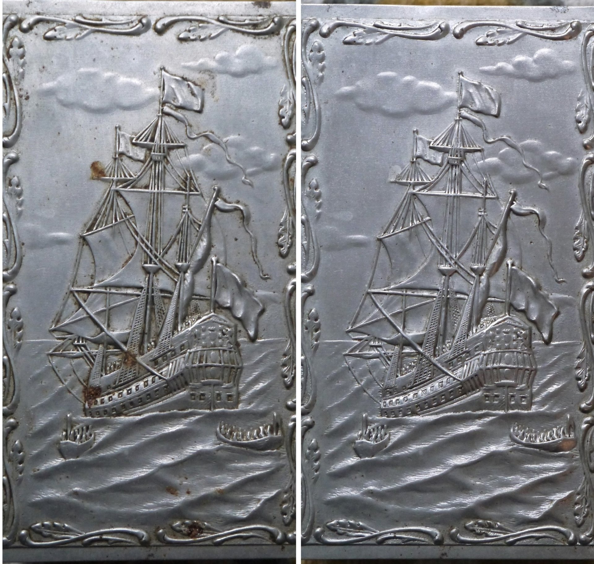 Restauration d'un étui de boîte d'allumettes métallique ornementé présentant des produits de corrosion.